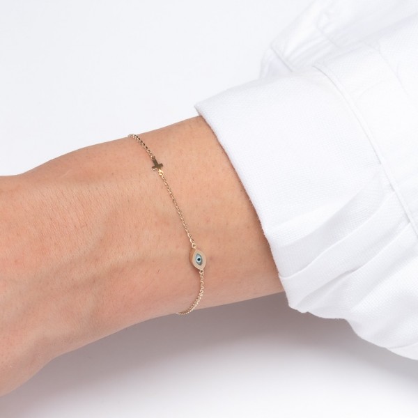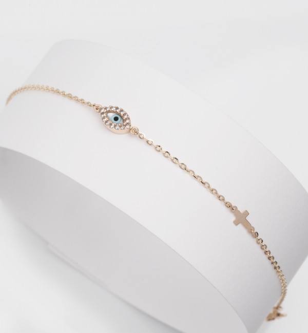 Βραχιόλι με οβάλ μάτι από φίλτνισι με λευκές συνθετικές πέτρες και μικρό πλάγιο σταυρό.